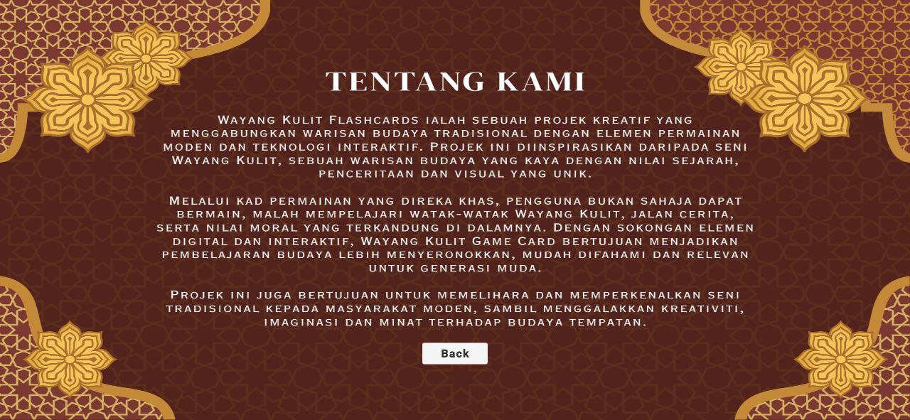 Wayang Kulit Flashcards ialah sebuah projek kreatif yang menggabungkan warisan budaya tradisional dengan elemen permainan moden dan teknologi interaktif. Projek ini diinspirasikan daripada seni Wayang Kulit, sebuah warisan budaya yang kaya dengan nilai sejarah, penceritaan dan visual yang unik.